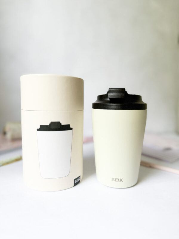 With your personal thermos coffee mug, you can save money and the environment. You don’t have to grab another disposable coffee cup. Take the thermos mug with you on your next adventure. It keeps your coffee or tea hot for up to 3 hours and your cold brew or iced tea refreshingly cold for up to 4 hours. The thermos mug is made of stainless steel and comes with a lid that has a small opening for easy sipping.