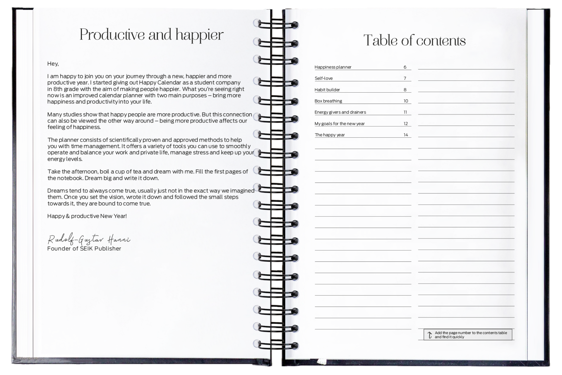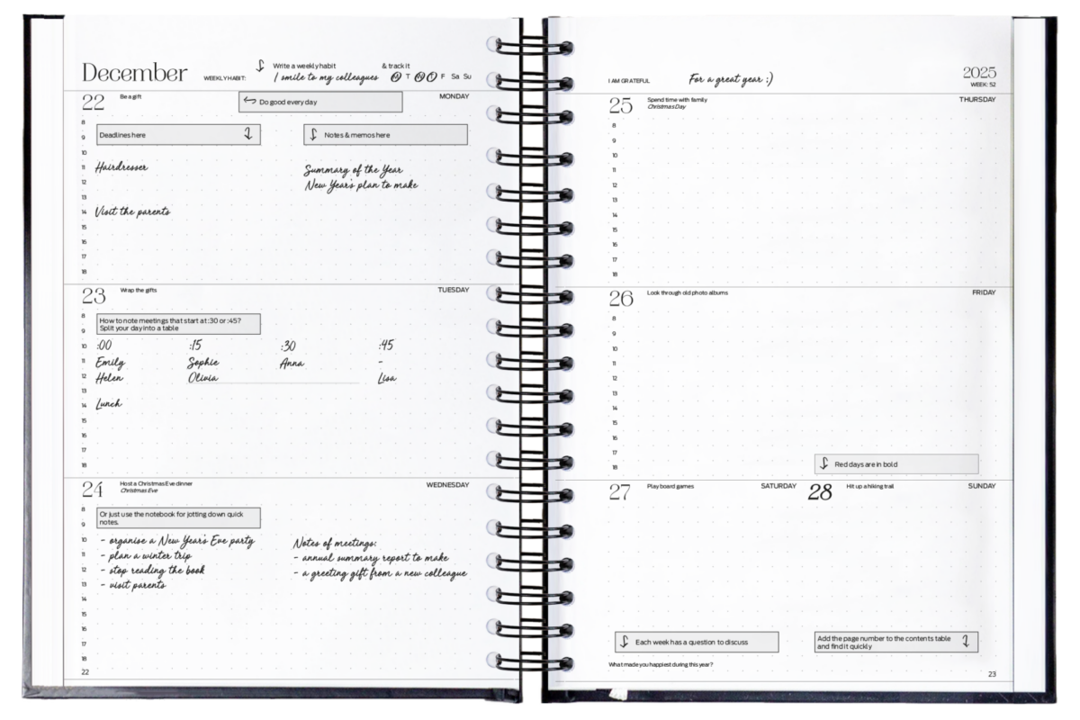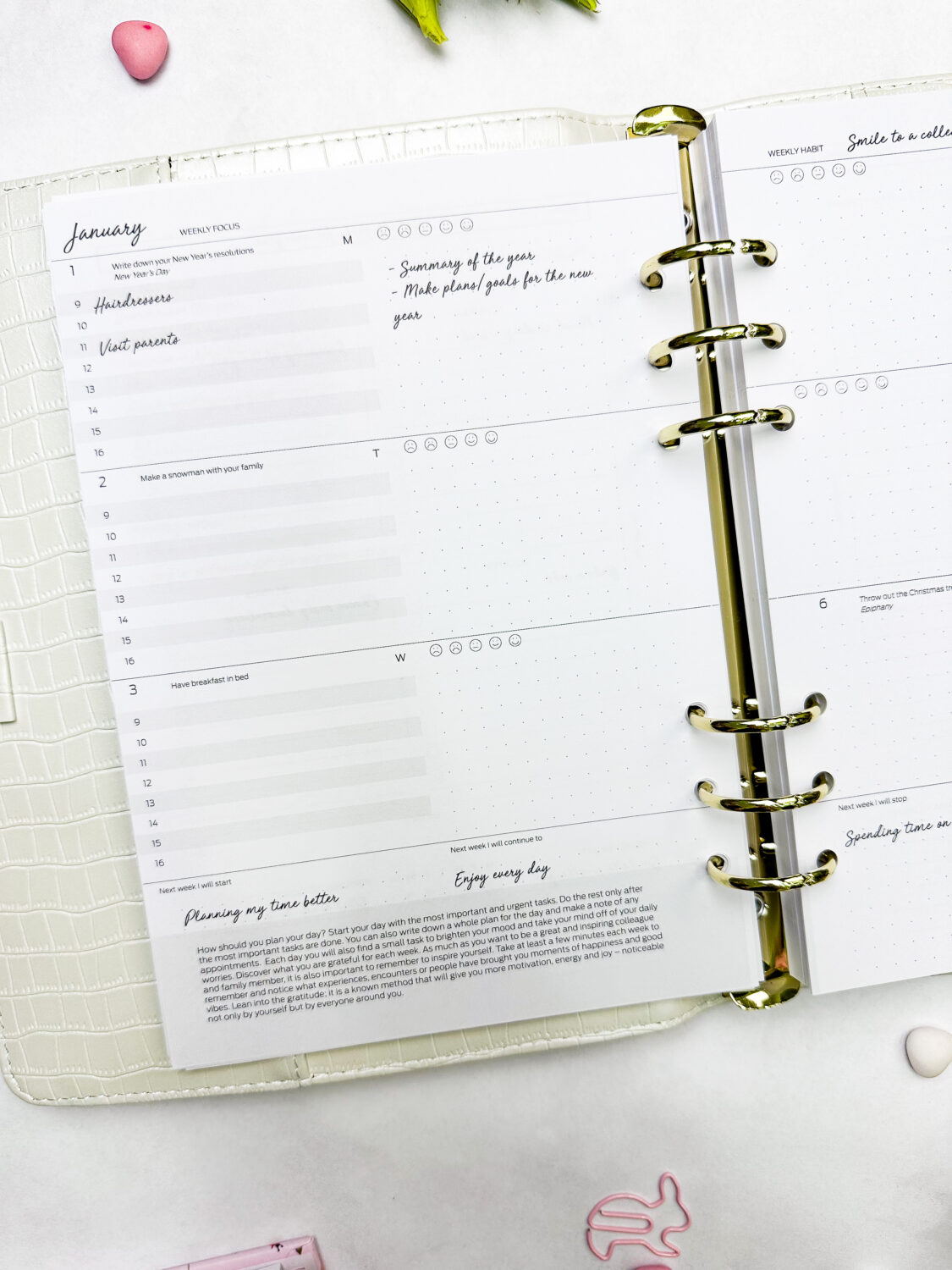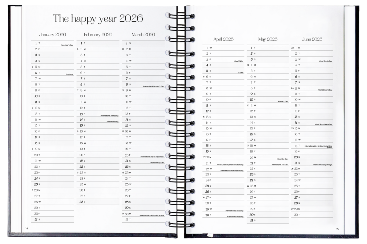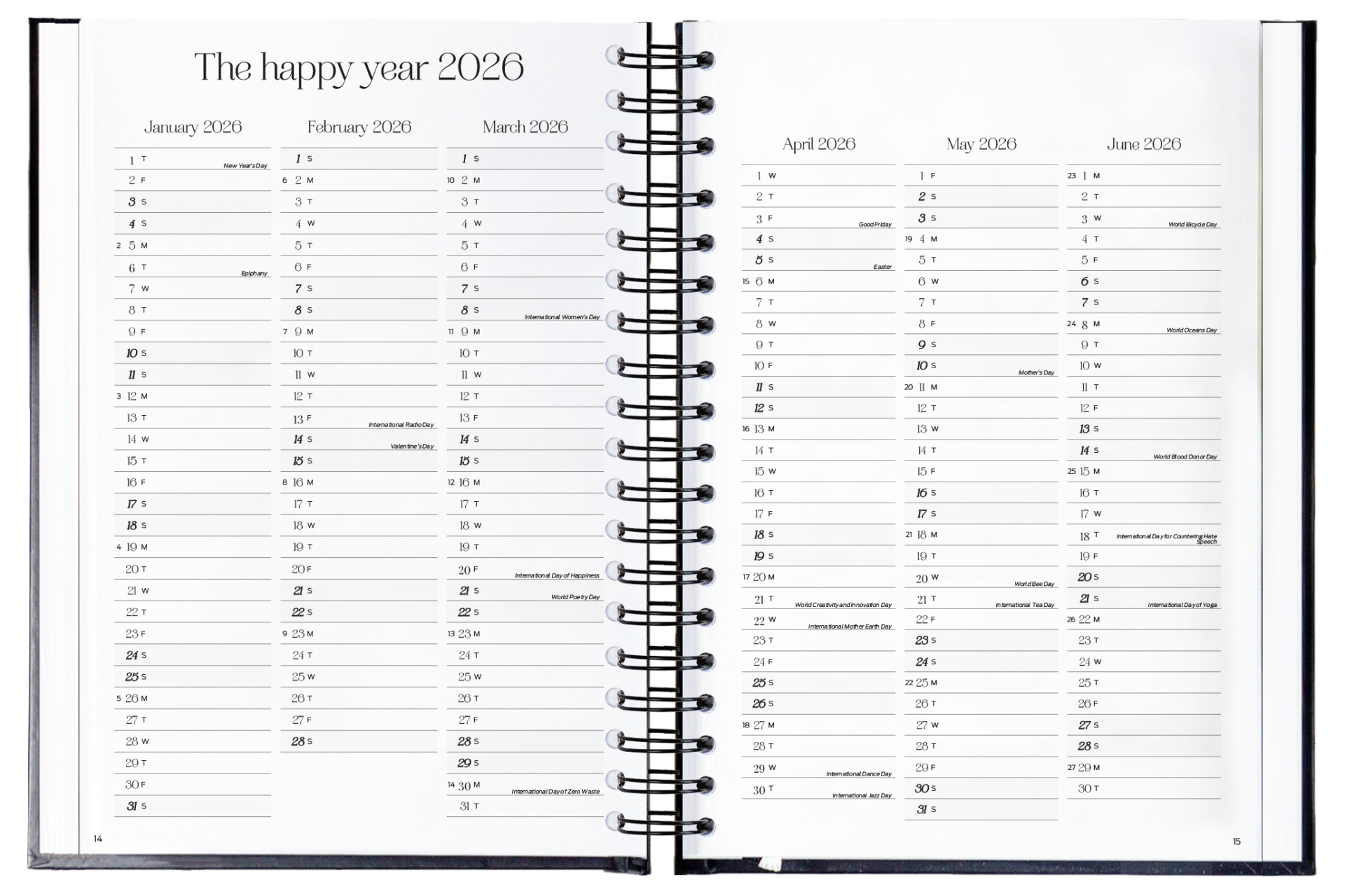 Plan your 2026 with a new Happy Calendar planner. Dream big and set goals for yourself. The diary provides ample space for recording your weekly tasks and objectives. In the new diary, you’ll also find the priority matrix from the productivity planner. At the end of the year, there are retrospective pages for analyzing your success. You can jot down your daily activities throughout 2026 in the planner. This diary gives you tools that you can start using immediately to make work and personal life run smoothly and shine with energy both at work and elsewhere. We wish your year to be exciting, full of adventures, and with plenty of time to enjoy the journey.