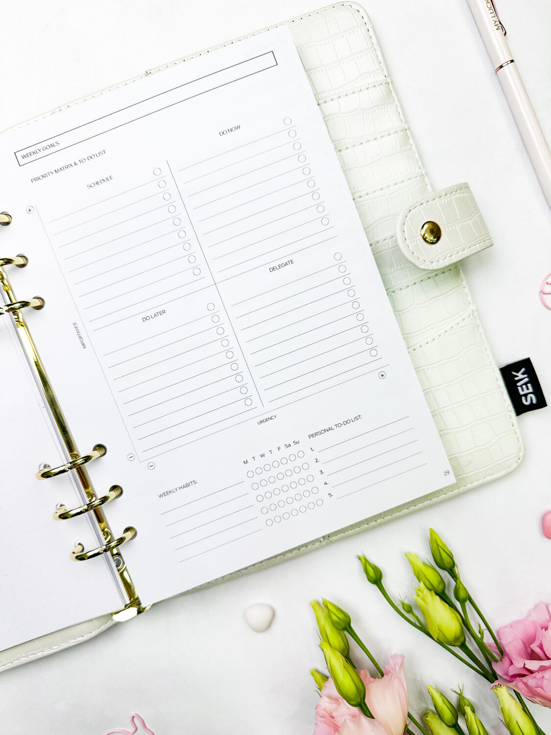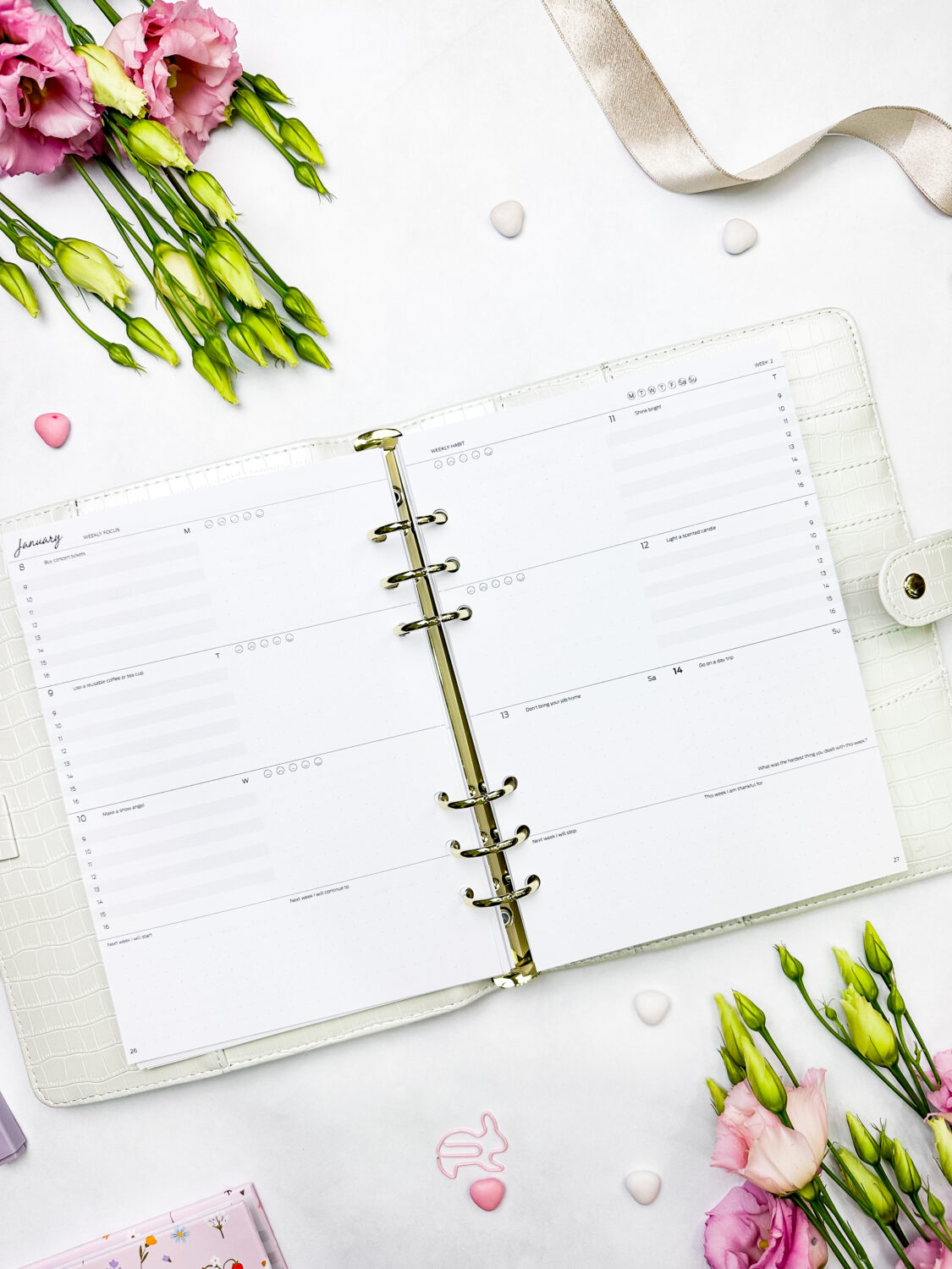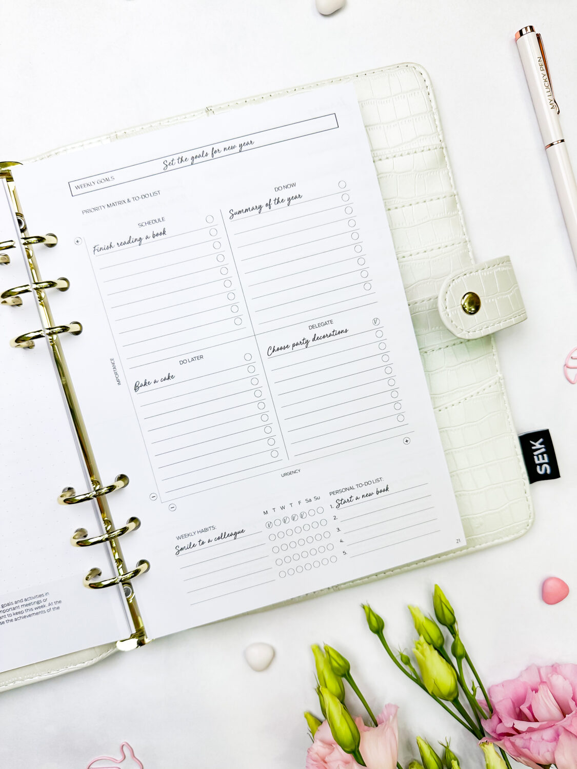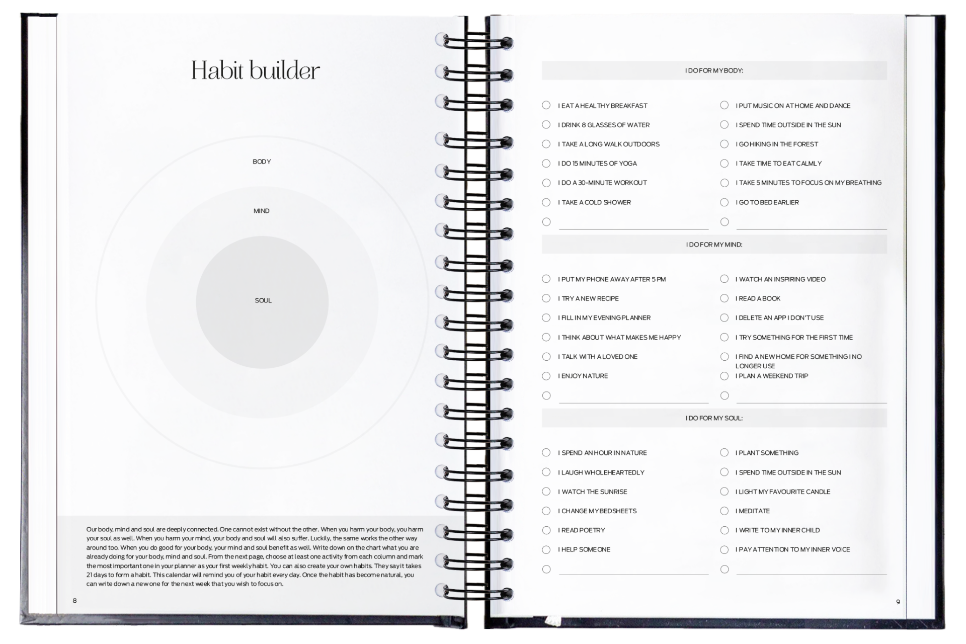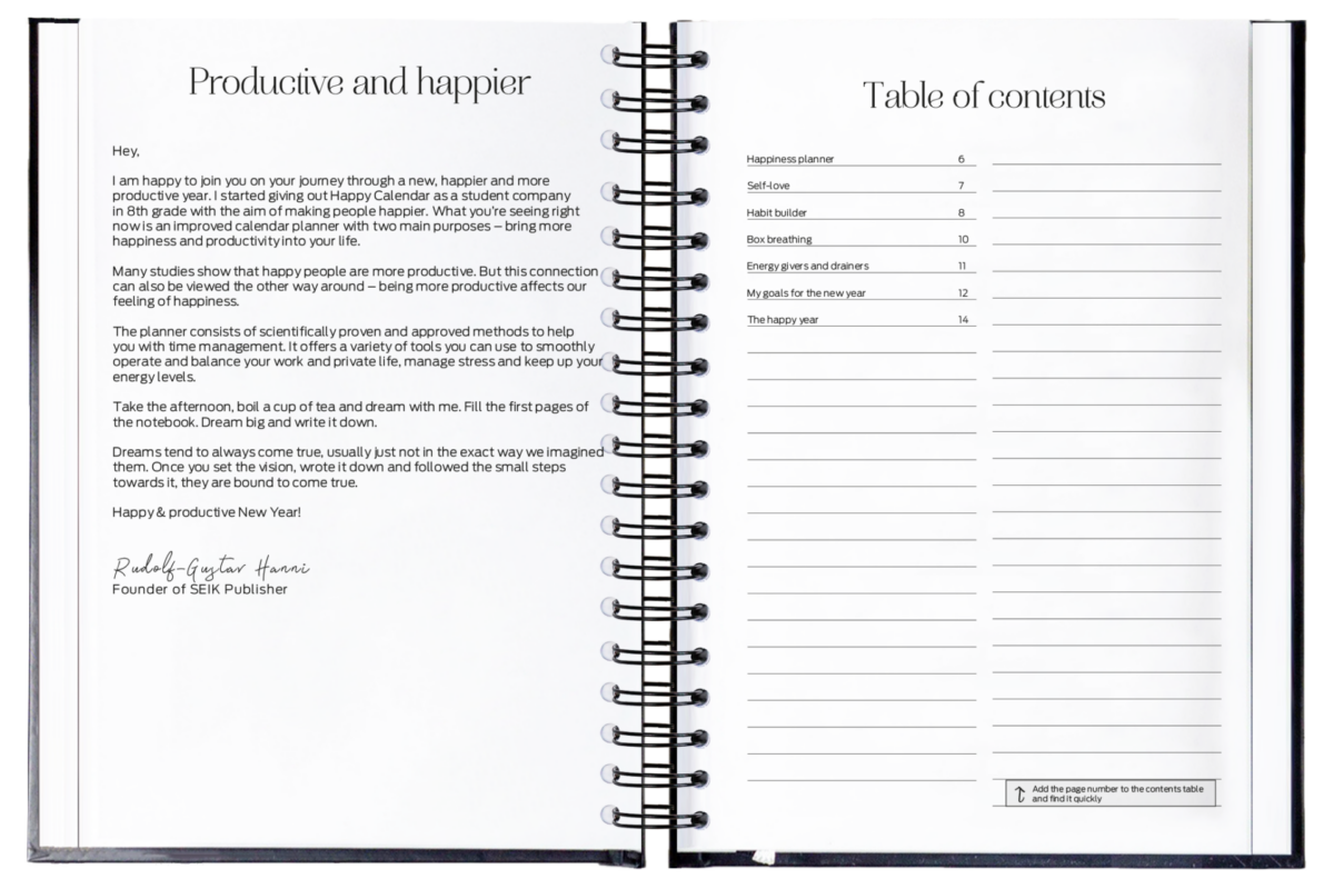Plan your 2026 with a new Happy Calendar planner. Dream big and set goals for yourself. The diary provides ample space for recording your weekly tasks and objectives. In the new diary, you’ll also find the priority matrix from the productivity planner. At the end of the year, there are retrospective pages for analyzing your success. You can jot down your daily activities throughout 2026 in the planner. This diary gives you tools that you can start using immediately to make work and personal life run smoothly and shine with energy both at work and elsewhere. We wish your year to be exciting, full of adventures, and with plenty of time to enjoy the journey.